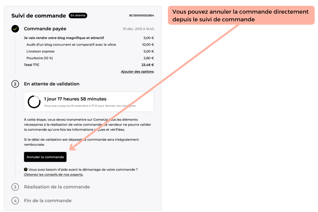 Si l’option d’annulation n’apparaît pas, cela signifie qu’une autre action est requise avant ou que la commande est déjà finalisée.